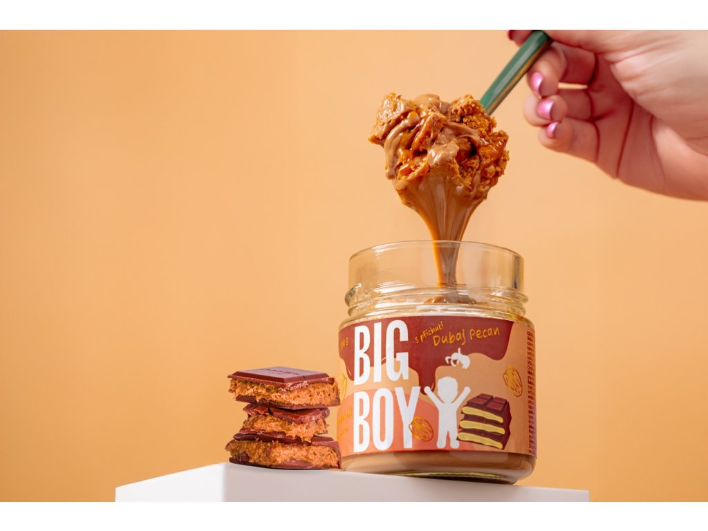 BIG BOY přináší chuť, která tě přenese až na Blízký východ – vrstvu karamelové bílé čokolády se špetkou soli a slaný karamel.. A pod ní? Sametově jemný pekanový krém, zjemněný mlékem a ghí, vyladěný do dokonalé oříškovo-karamelové harmonie.